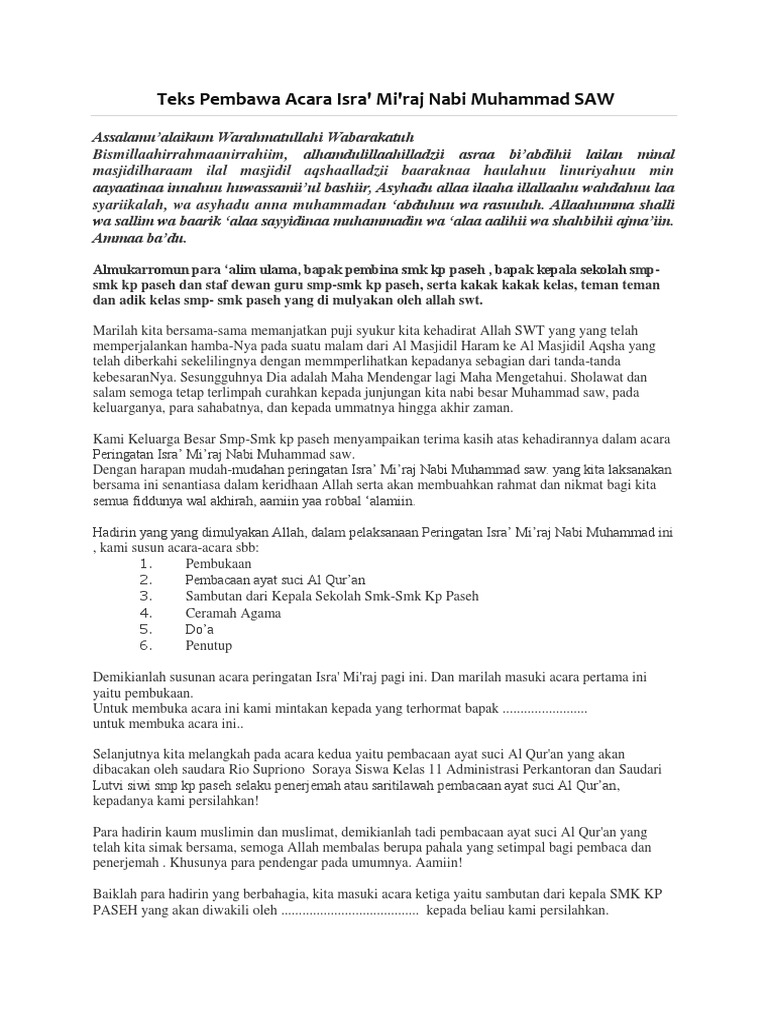 Kami disini sebagai pembawa acara akan membacakan susunan acara isra mi raj pada malam ini. Para hadirin sekalian yang. Masroziq – Contoh Teks Pembawa Acara MC Isra Miraj Di Sekolahan.
