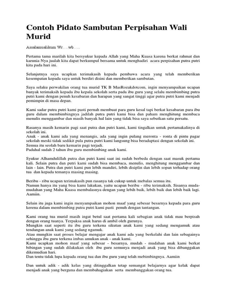 Dengan memanjatkan puja syukur ke hadirat Tuhan YME bahwa pada detik ini kita bisa betatap muka kenal mengenal antara Wali Murid dan Dewan Guru dan baru kali inilah kita. Masroziq – Contoh Pidato Sambutan Wali Murid Perpisahan Sekolah Perpisahan sekolah biasanya tidak hanya melibatkan Bapk Ibu guru dan siswa saja namun biasnaya mengundang seluruh wali murid yang terkhusus putra putrinya mengikuti perpisahan dengan sekolah terebut dan juga diberikan perwakilan untuk memberikan smabutan atas nama dari wali murid. Wali Murid TKATPA Cahaya Harapan Yang kami banggakan anak-anakku tercinta Izinkan saya memberikan kata sambutan mewakili wali murid TK B.