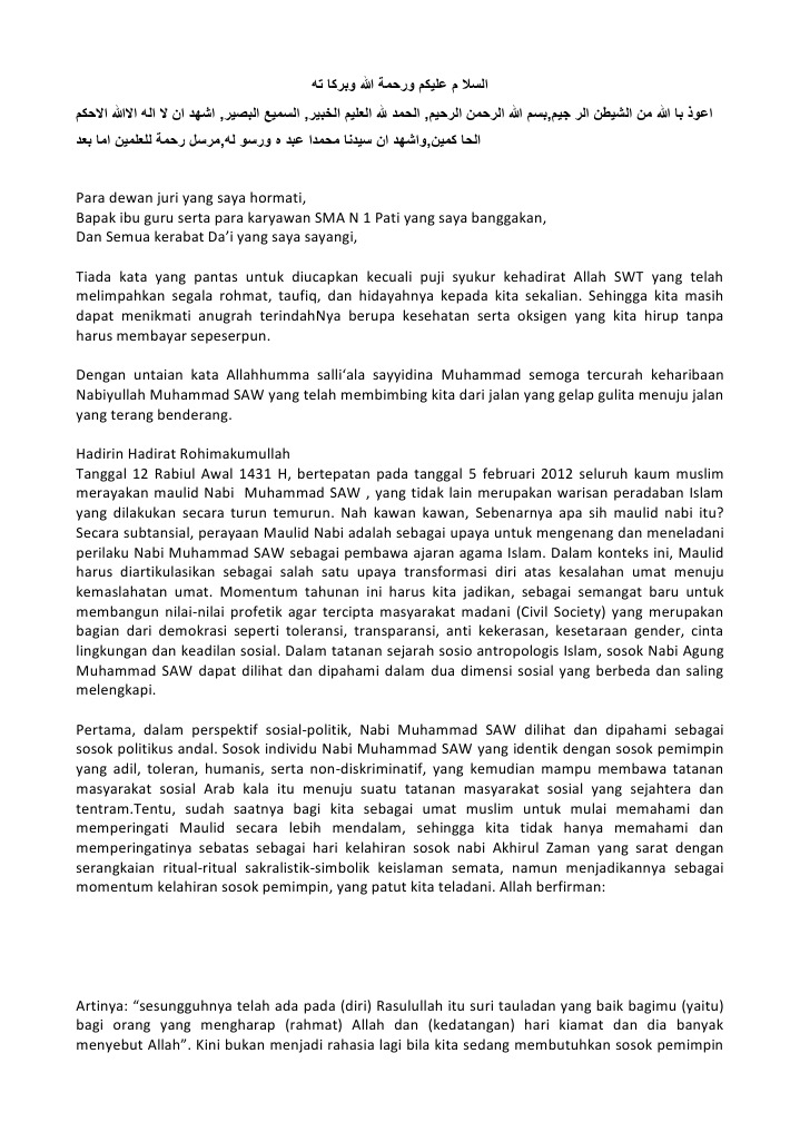 Berikut ini contoh teks pidato sambutan dan ceramah peringatan Maulid Nabi Muhammad SAW. Pada pagi yang berbahagia dan penuh berkah ini marilah kita panjatkan puji syukur kehadirat Allah Subhanahu Wattaala yang senantiasa memberikan kita limpahan rahmat serta ridho. أما بعد Pertama-tama mari kita ucapkan puja dan puji syukur kehadirat Allah Swt yang tetap senantiasa melimpahkan taufik dan hidayah rahmat dan nikmatnya kepada kita semua.