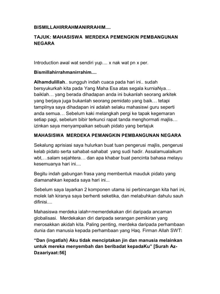 Teks Pidato Mahasiswa Merdeka Pemangkin Pembangunan Negara