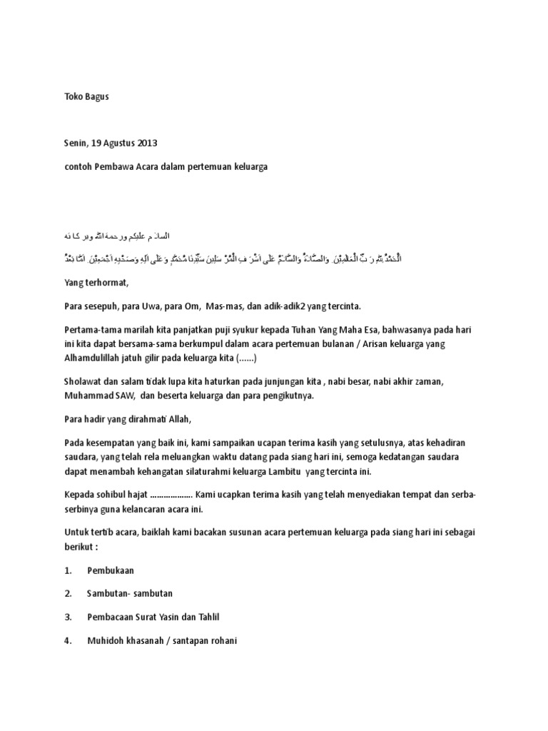 Pembukaan Pembukaan teks pidato berisi. Contoh surat undangan arisan rt yang baik belajar office- susunan acara arisan beinyu – contoh susunan acara arisan keluarga pontren – contoh teks susunan acara. Informasi tentang contoh teks untuk mc pembawa acara arisan RT Bahasa Jawa dan Indonesia pertemuan rutin rapat Bapak-bapak pada lingkungan kompleks perumahan.