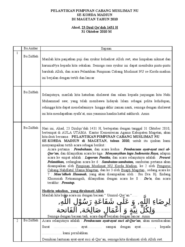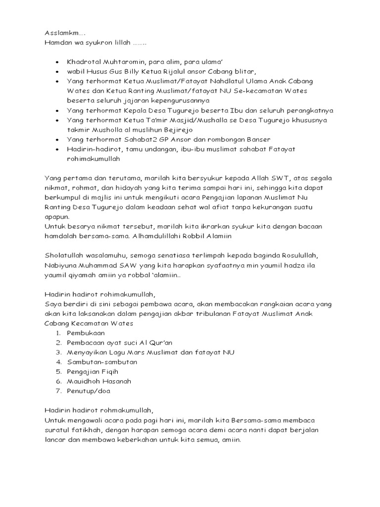 Wednesday January 20 2021. Dalam contoh ini masih dimungkinkan untuk diubah dalam pengertian ditambah dan atau dikurangi oleh calon. Teks Mc Pengajian Rutinan Jum At Pahing Muslimat Nahdlatul Ulama Anak Cabang.
