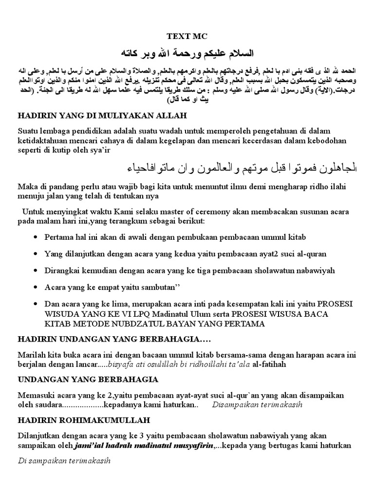 Teks pembawa acara imtihan. Nah berikut adalah daftar Contoh Teks MC Atau Pembawa Acara Berbagai Acara. Berikut contoh teks pembawa acara pengajian yang dihimpun dari buku Menjadi Public Speaker Andal oleh Viera Restuani Adia Assalamualaikum Wr. Contoh Format Dalam Rangka Haflatul Imtihan dan Haul Alm.