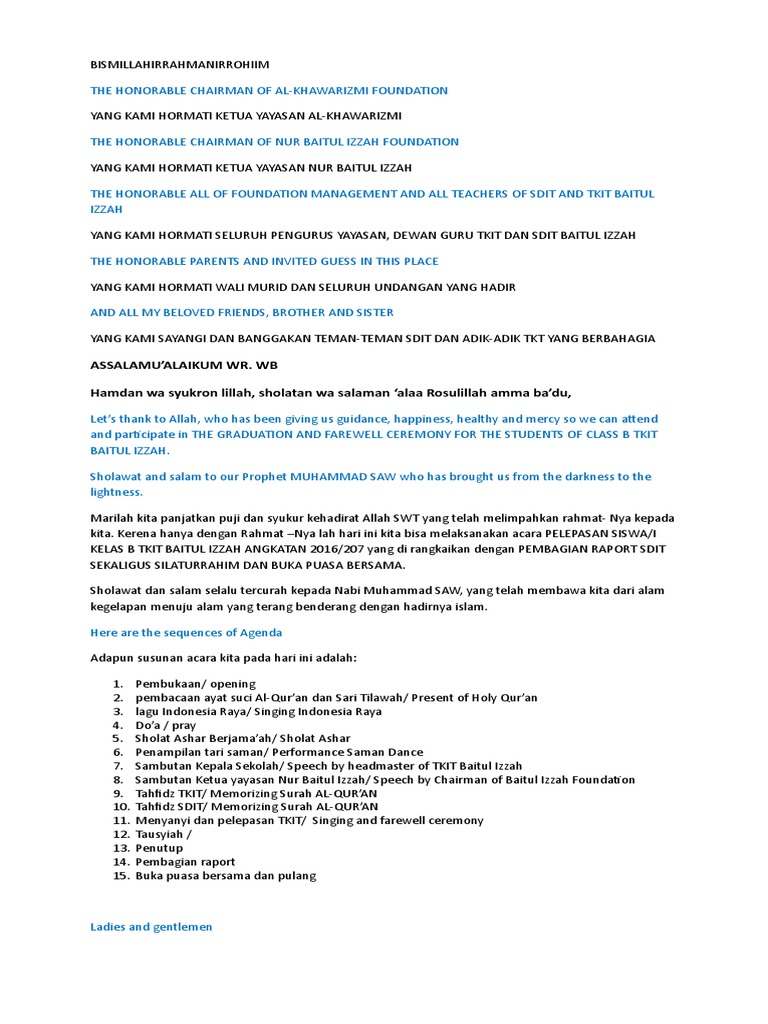 Susunan Acara Kenaikan Kelas. Dan mohon maaf apabila terdapat hal atau kata-kata yang kurang berkenan di hati hadirin sekalian. Berikut referensi terbaik 7 contoh teks mc acara.