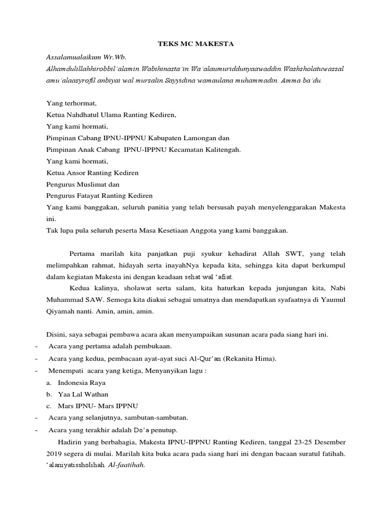 Kepada bapakIbu dan para tamu undangan yang saya hormati. Contoh Teks MC Pengajian Fattayat. Contoh 2 Teks Naskah MC Bahasa Jawa Untuk Pengajian Akbar Assalaamualaikum WrWb Ingkang kinabekten panjenegan ipun ustadz Wuntut Wawan Sembodo.