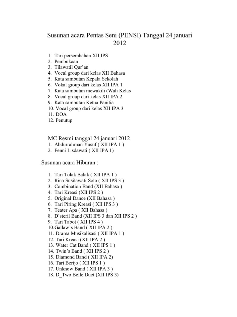 Teks Mc Formal Pensi. Dengan mengucap Alahmdulillah segala rahmat yang telah diberikan tentunya terimakasih kepada Allah SWT. Susunan Acara Pentas Seni PENSI 1.