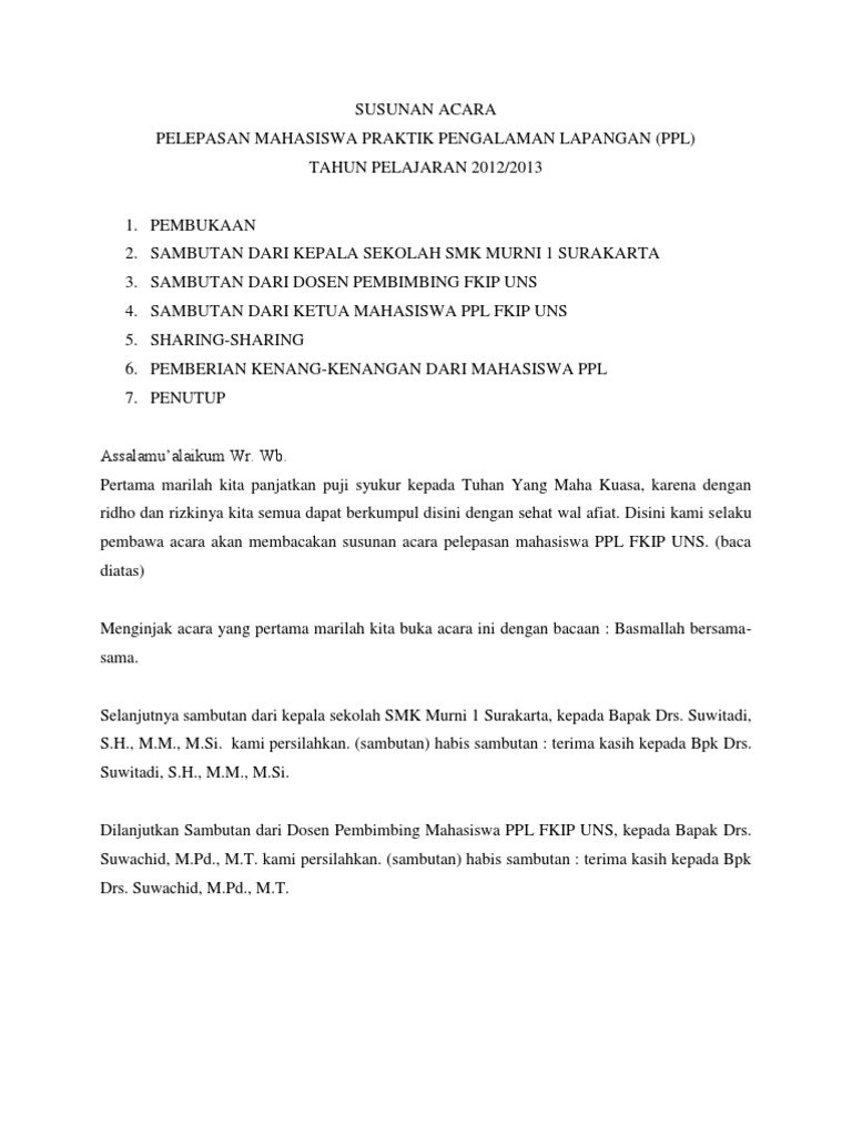 Acara perpisahan menjadi momen yang bahagia sekaligus sedih karena menjadi momentum tepat untuk mengucapkan terima kasih kepada guru yang telah mengajar dan. Yang kami hormati BapakIbu Guru dan Staf Karyawan SMK 1 Pundong. Contoh susunan acara perpisahan sekolah singkat dan kreatif cocok untuk wisuda purna siswa sma.