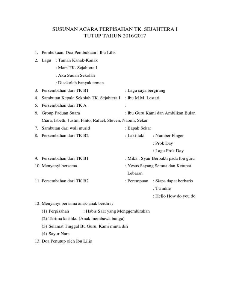 Teks pembawa acara perpisahan tk. Untuk acara TK dan SD. Contoh doa penutup acara perpisahanAssalamu al a ikum wr wb.