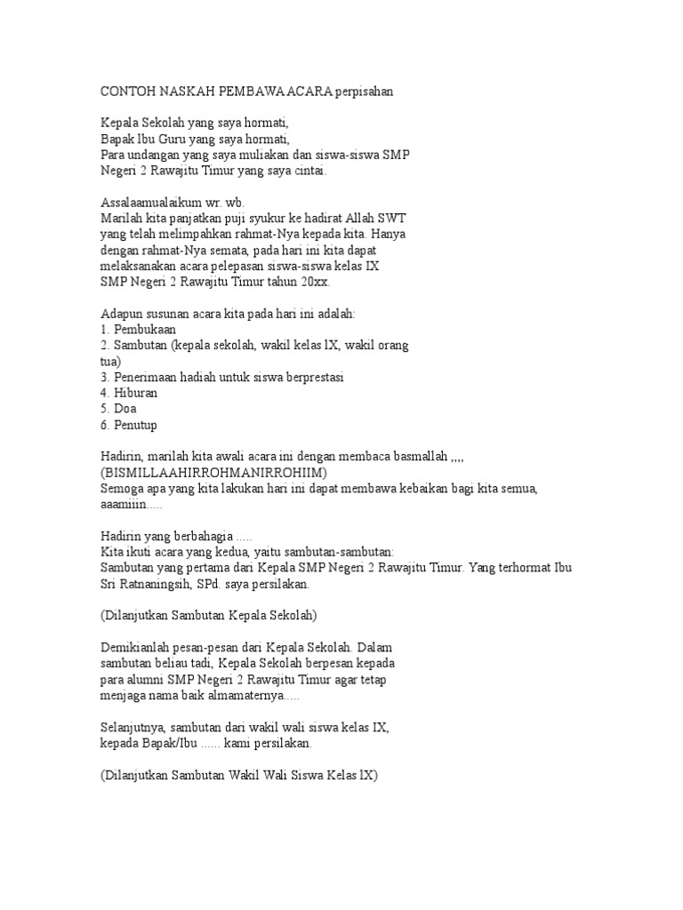 Contoh naskah pembawa acara perpisahan sekolah. Hanya dengan rahmat-Nya semata pada hari ini kita dapat melaksanakan acara pelepasan siswa-siswa kelas IX SMP Negeri 2 Tanta tahun 2011. Perpisahan sekolah ini mulai dari TK SD SMP dan SMA diselenggarakan dengan susunan acara tertentu.