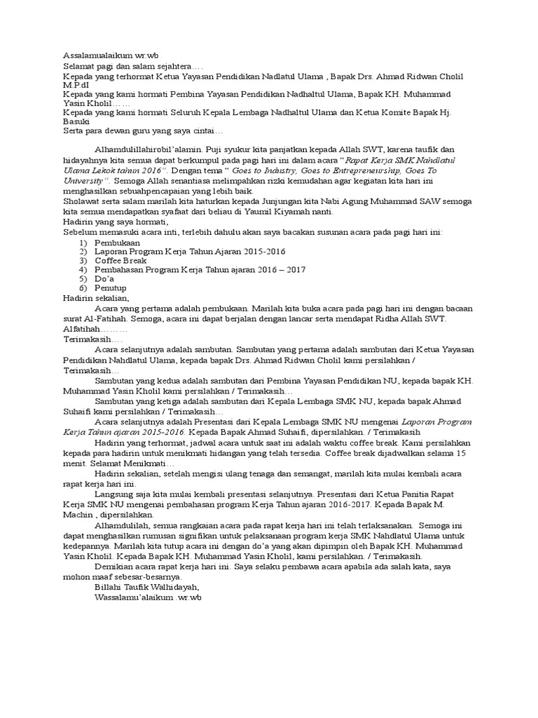 Contoh Teks pembawa acara rapat kerja Dalam dunia kerja tentu akan ada waktu tertentu yakni melaksanakan acara rutinan rapad yang biasa dilaksanakan dalam waktu satu. Contoh Teks Pembawa Acara Rapat Wali Murid Berbagi Teks contoh 7 contoh teks pembawa acara contoh 1 yang terhormat ibu ketua persit kartika chandra kirana kodim 0818. Contoh teks pembawa acara.