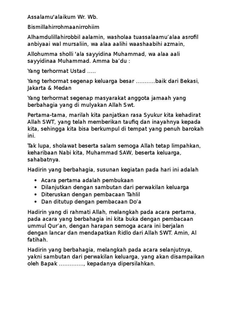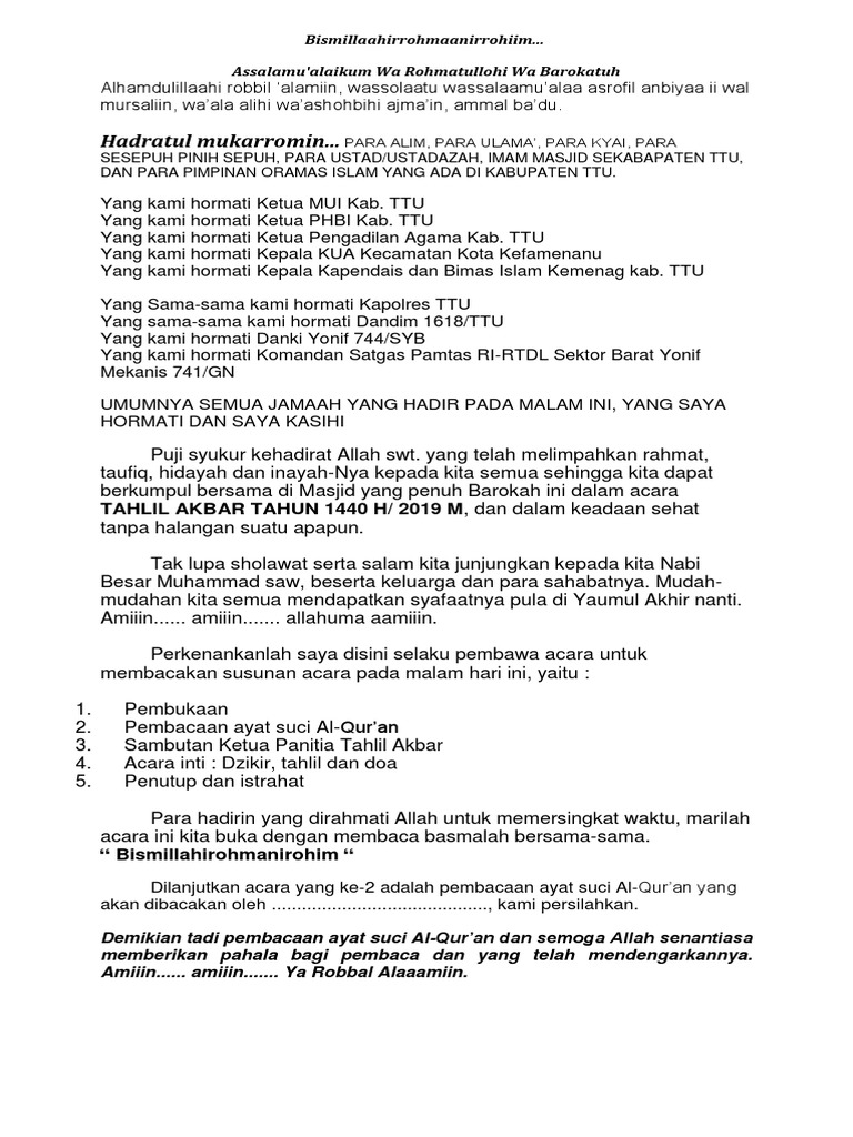 Teks pembawa acara tahlilan. Contoh Teks Sambutan Tuan Rumah Pada Acara Tahlilan Malam Ke 7 Alhamdulillahirobbil aalamin washolaa tuassalaamualaa asrofil anbiyaai wal mursaliin wa. Alhamdulillah Alhamdulllahilladzi anzala sakinata fiiqulubil muminin liyazdaadu iimanan maaa immanihim. September 22 2014 by admin 0.