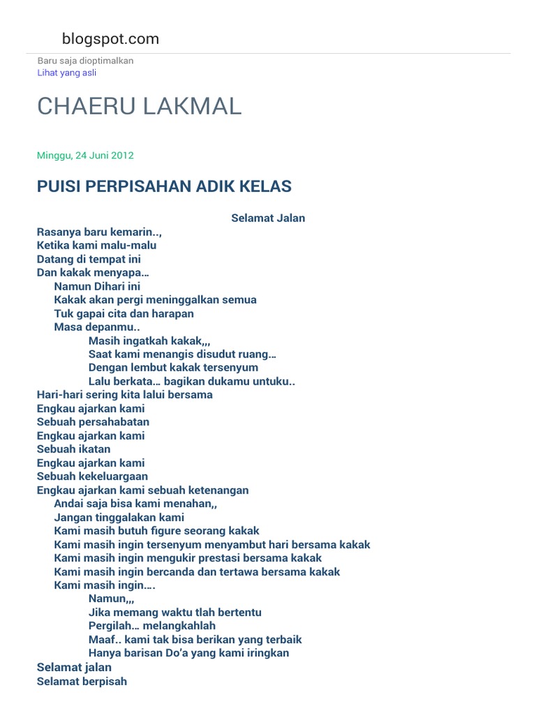 Web Inilah deretan puisi untuk kakak kelas yang disukai yang dikutip dari buku Goresan Jiwa Pejuang Asa Fitria Sartika 2020. Web Artikel ini akan membahas mengenai contoh pidato perwakilan adik kelas di acara perpisahan sekolah. Web Wassalamualaikum WrWb Sambutan Perpisahan Adik Kelas Kepada Kakak Kelas.