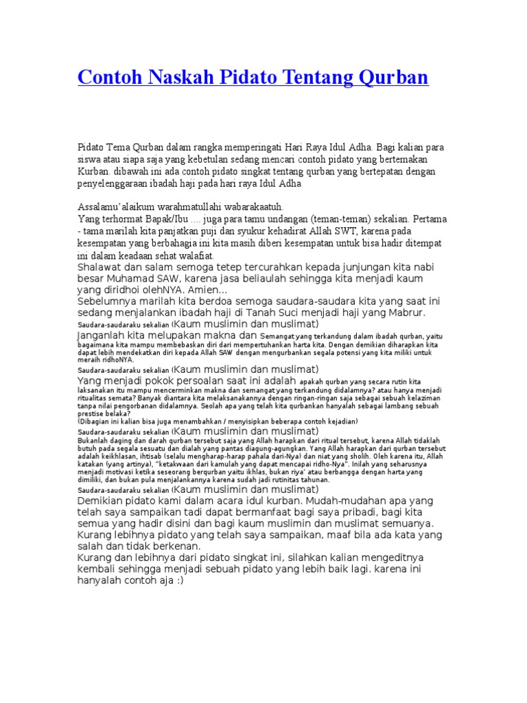 Menyambung tali kasih merajut benang cinta beralas ikhlas beratap doa. Saudara kaum muslimin-muslimat yang dimuliakan oleh Allah Alhamdulillah pada pagi hari ini kita bisa. Web Conoh Pidato Dalam Memperingai Pengorbanan Nabis Ismail pada hari raya Idul Adha dengan bahasa jawa.