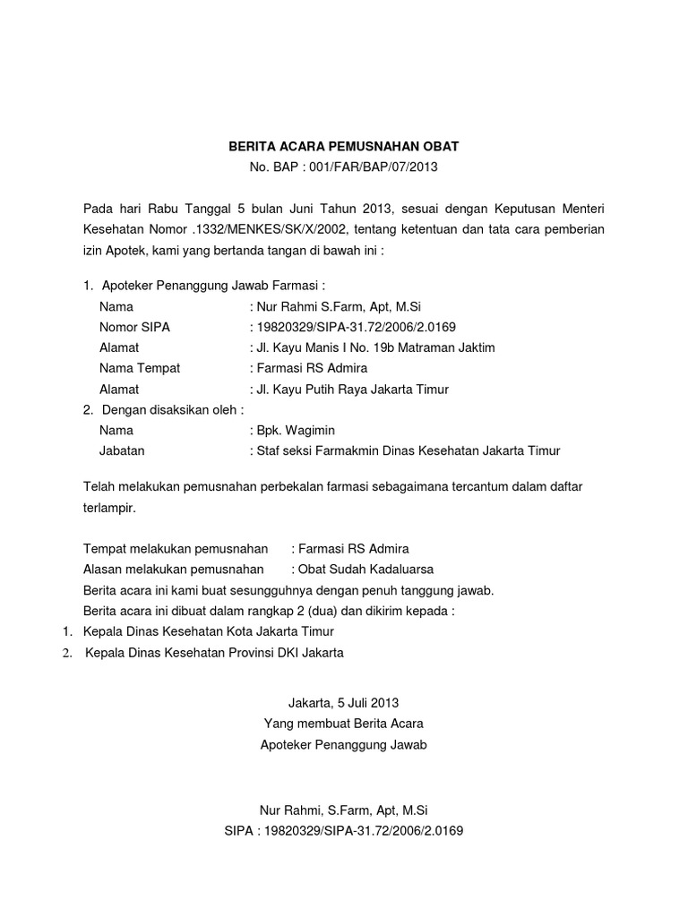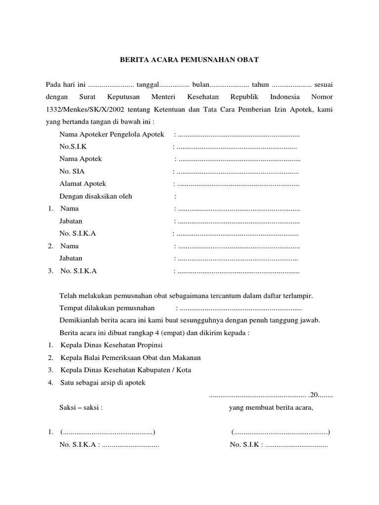 Sesuai peraturan yang berlaku resep harus disimpan minimal selama 5 tahun. Untuk Ketua Organisasi dalam Sebuah Rapat. Web Jabatan Telah melakukan pemusnahan Obat sebagaimana tercantum dalam daftar terlampir Tempat dilakukan pemusnahan Demikilianlah berita acara ini kami buat.