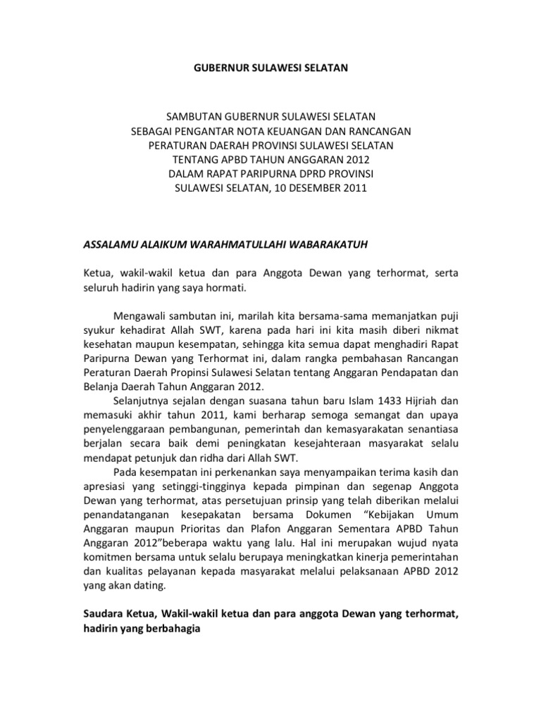 Sambutan Gubernur Sulawesi Selatan Tentang Apbd 2012