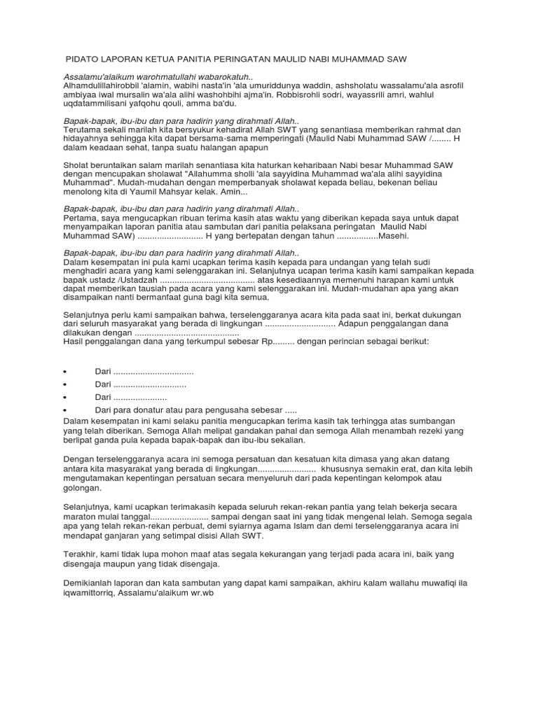 Teks sambutan ketua panitia maulid pdf. Alhamdulillahirobbil alamin wabihi nastain ala umuriddunya waddin ashsholatu wassalamuala asrofil ambiyaa iwal mursalin. Sebagai ketua panitia dalam hal ini ingin mengucapkan terimakasih kepada bapakibu para hadirin yang berkenan hadir diacara memperingati Maulid Nabi Muhammad. Contoh Sambutan Ketua Panitia Lomba 17an I Assalamualaikum Wr.