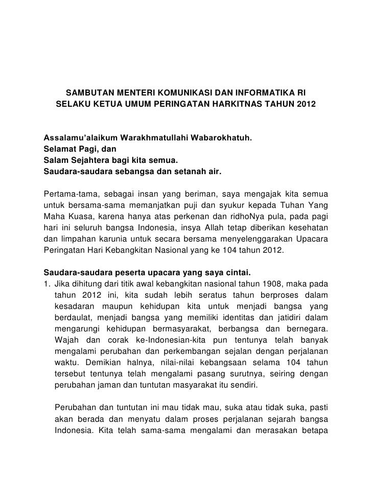 Web Seluruh bangsa Indonesia hari ini 20 Mei memperingati ke-114 Hari Kebangkitan Nasional Harkitnas. Sambutan Menkominfo Harkitnaspdfpdf Sumber. Web SAMBUTAN MENTERI KOMUNIKASI DAN INFORMATIKA RI SELAKU KETUA UMUM PERINGATAN HARKITNAS TAHUN 2012 Assalamualaikum Warakhmatullahi.