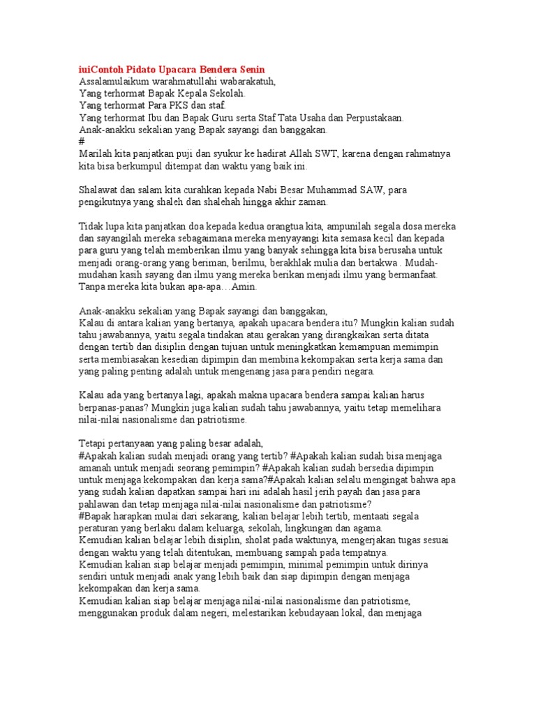 Masing-masing pemimpin barisan akan menyiapkan setiap. Web Demikian amanat pembina upacara pada hari Senin ini mohon maaf bila terdapat kekurangan atau kesalahan. Web Naskah pidato amanat upacara bendera hari Senin biasanya disampaikan pembina upacara baik itu kepala sekolah maupun guru yang bertugas.