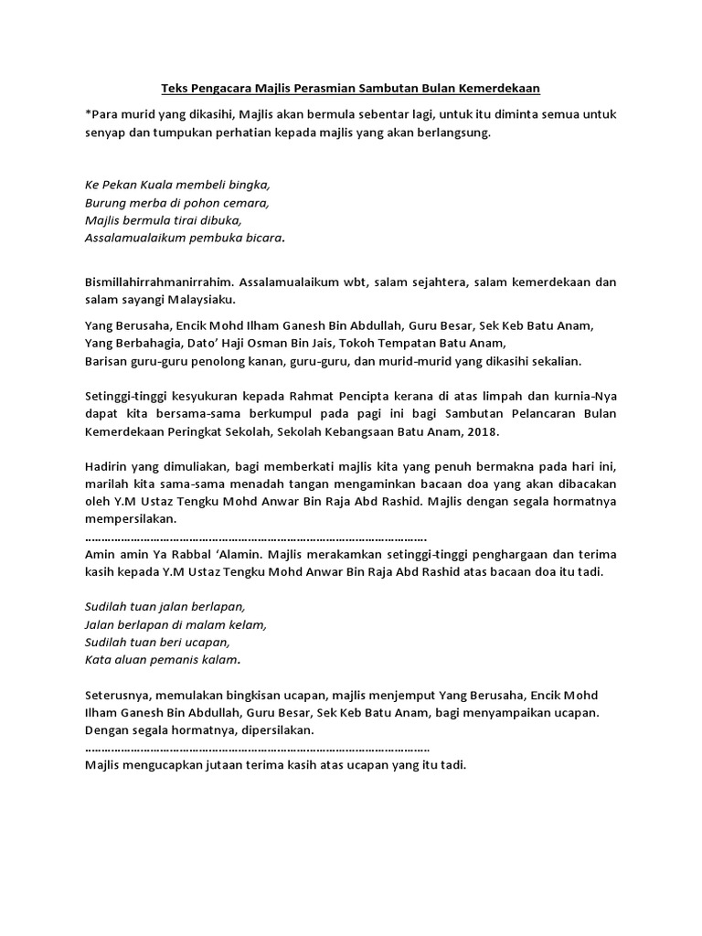 Teks Ucapan Guru Besar Sempena Pelancaran Bulan Kemerdekaan