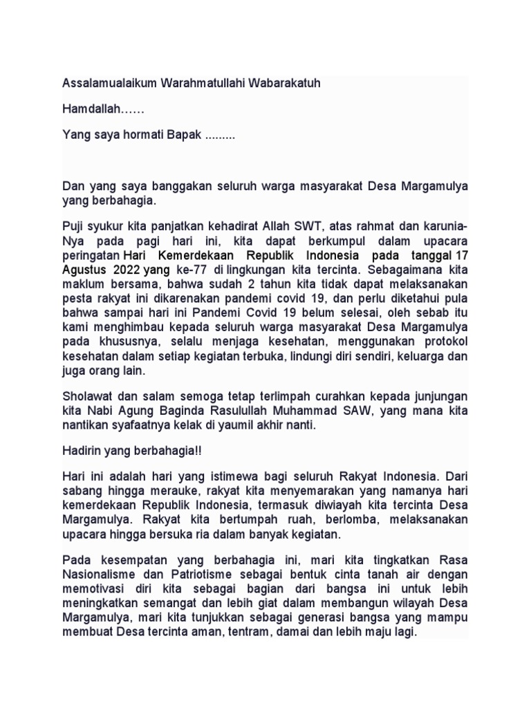 Web Berikut ini contoh-contoh naskah teks pidato atau sambutan HUT ke-77 RI padaupacara atau gelaran acara 17 Agustusan. Web Sambutan Mendikbudristek Pada Upacara Peringatan HUT ke-77 Kemerdekaan RI Tahun 2022 Sumber berita httpswwwkemdikbudgoid SEKRETARIAT JENDERAL. Web Dalam upacara bendera peringatan Hari Kemerdekaan Indonesia umumnya akan ada amanat pembina upacara begitupun saat pembukaan acara kegiatan HUT RI.
