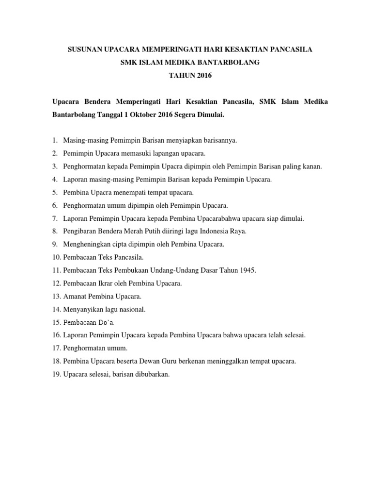 Teks sambutan upacara kesaktian pancasila 2019. Nama ini terdiri dari dua kata dari bahasa Sanskerta. Serta – MC sebanyak 1 orang cadangan 1 orang. Upacara dilaksanakan pada hari Selasa 1 Oktober 2019 secara.